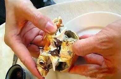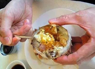 3、先吃蟹盖部分,用小勺把中间的蟹胃部分舀出,轻轻将外面包裹着的蟹黄吮干净。注意,不要吮破中间那个呈三角锥形的蟹胃,应将其丢弃。