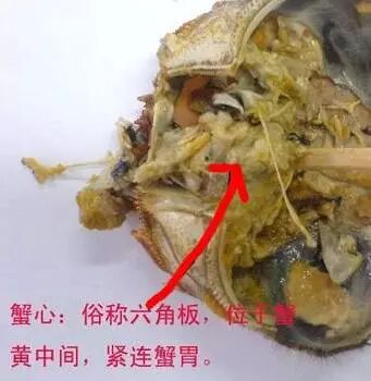 5、用勺柄将蟹身中间一个呈六角形的片状物挑出来,那是蟹心部分,丢弃。