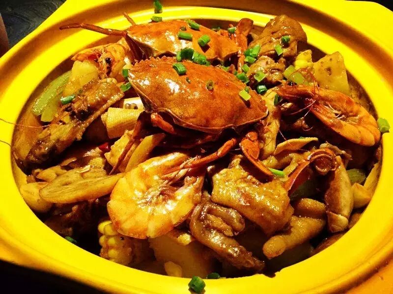 顾名思义,这是一道用料极为丰富和考究的菜肴。精选优质的缅甸活蟹,饱满的橘红色蟹黄以及白嫩的蟹肉,这就是舌尖上的大航海时代。里面配搭的是巴西进口的鲜嫩鸡爪,一口下去骨肉分离,满满的胶原蛋白,小编是甩开腮帮下筷如飞。只有这两样又怎敢自称“全家福”?这一煲中还有鸡翅以及墨鱼丸,佐以当日到店的新鲜蔬菜配料:莴笋,玉米,土豆,藕片和年糕。真正给你海陆两地的超凡体验!!!