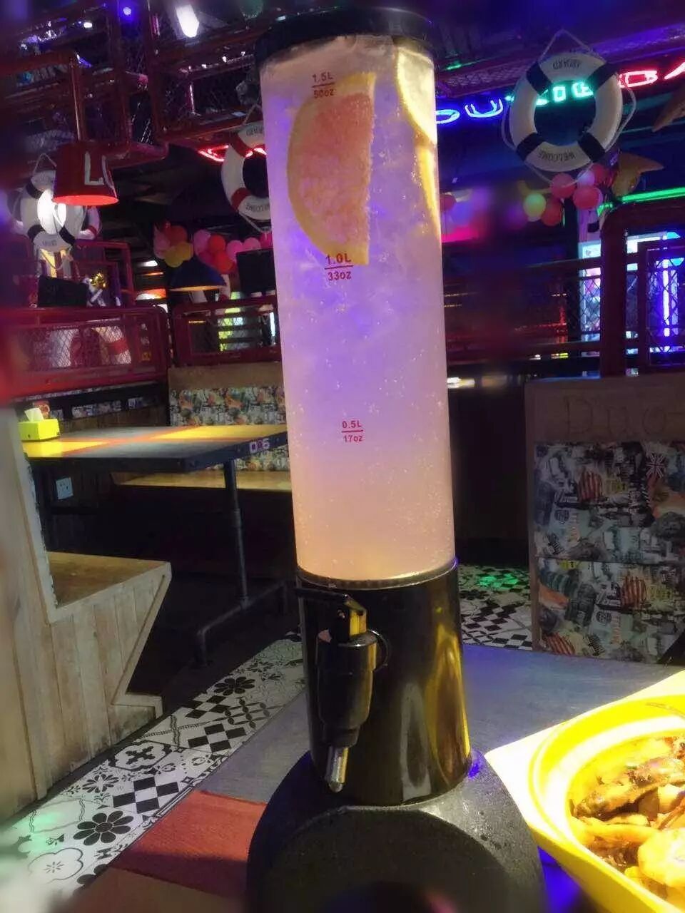 饮品中小编特推“一炮西柚”,外形高大到霸气的酒炮里装着清凉爽口的西柚泡泡水,配搭上新鲜的柠檬,清新美味。(28元)