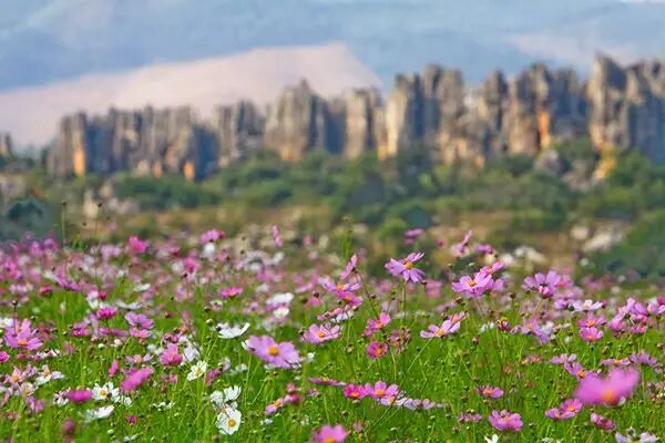 距石林景区8公里处,有一片威严耸峙的黑色石林,面积8平方公里。旧名石门峰或石门哨。乃古石林景区面积约10平方公里,由东区、西区、白云湖、白云洞、古战场等组成。每年十月份都有大片波斯菊开放,不是一般的美!
