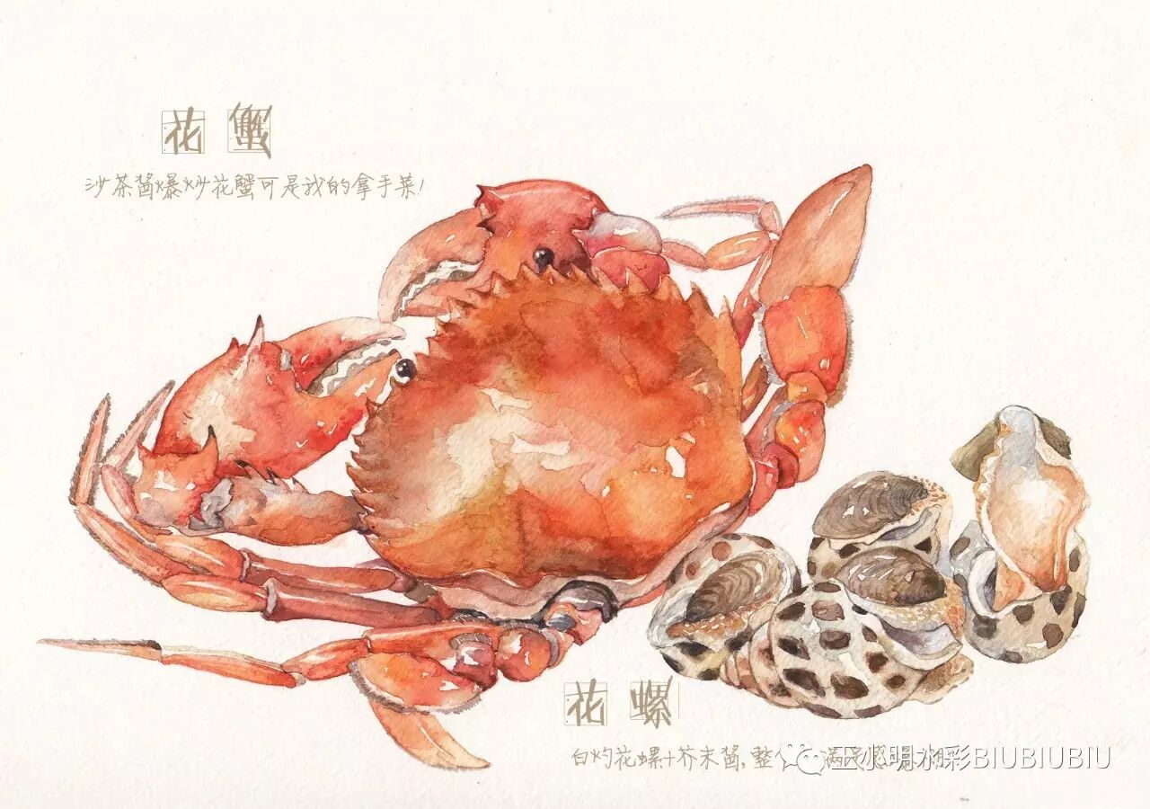 水彩 | 花蟹+花螺 . 绘于2013年12月。