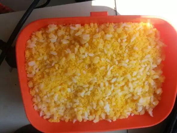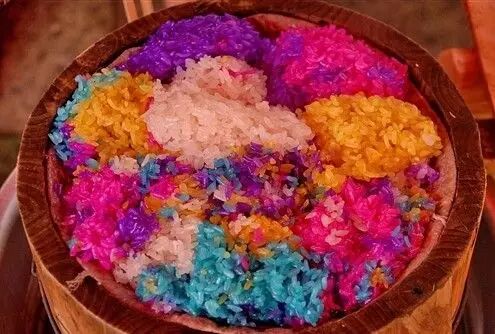 黔南是布依族苗族聚居地,五色米饭是布依族的特色,不但色彩鲜艳,而且味道悠远。色彩一般有红、紫、黑、白、黄几种,叫“五色花米饭”,有的只染红、黄、白三色,叫“三色花米饭”。