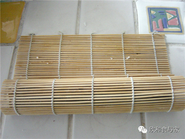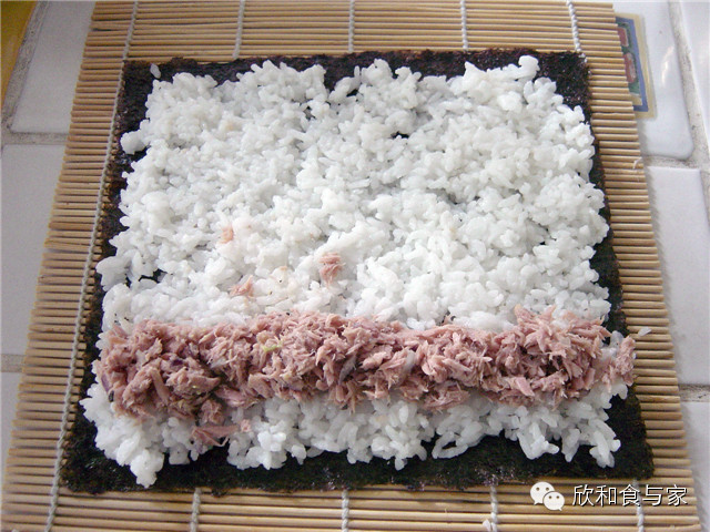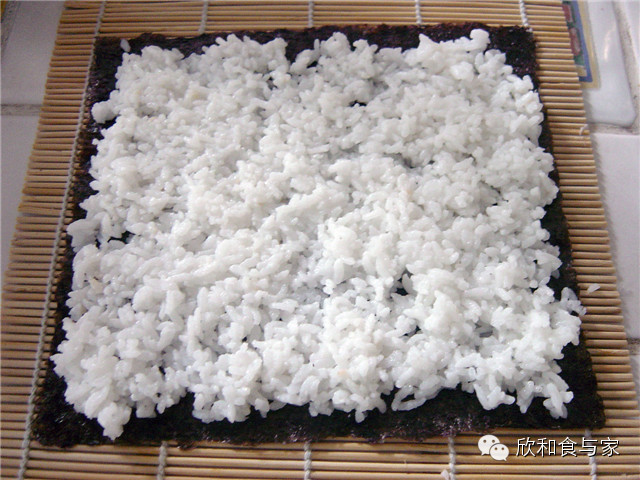 3、紫菜放在寿司帘上,比较粗糙的一面朝上,加入米饭平铺均匀,在紫菜的一端留一寸的空隙,这是最后收口的地方;