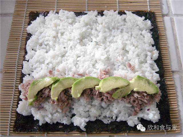 4、米饭上加上一条金枪鱼碎,再加上切成条的牛油果,卷寿司帘用紫菜和米饭把夹心卷紧,在接口处涂一层水,卷好后把寿司卷压在接口处至定型。