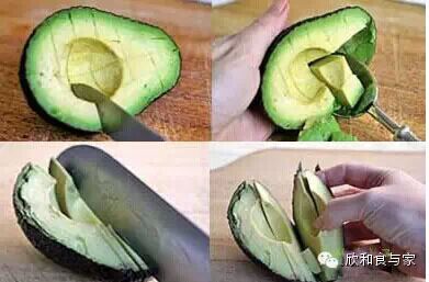 要想得到牛油果片,你可以用到纵向切割牛油果(注意不要切到皮,如果你不幸切到了皮,并且切断了,也没什么,用手剥皮吧),用手就可以轻松取出牛油果片了。