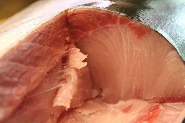 一看就知道新鲜,淡粉红色,充满光泽~油脂分布非常均匀~纹路清晰~油花均匀的散布于每丝鱼肉当中~