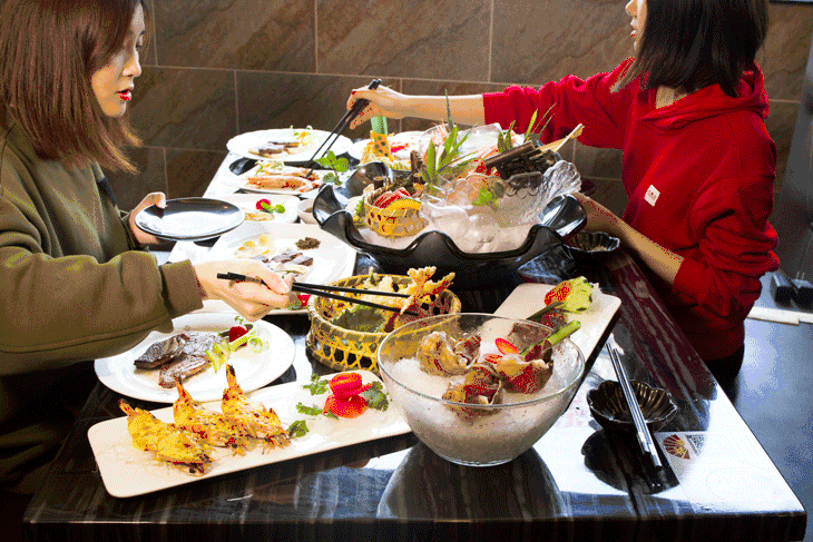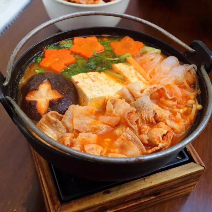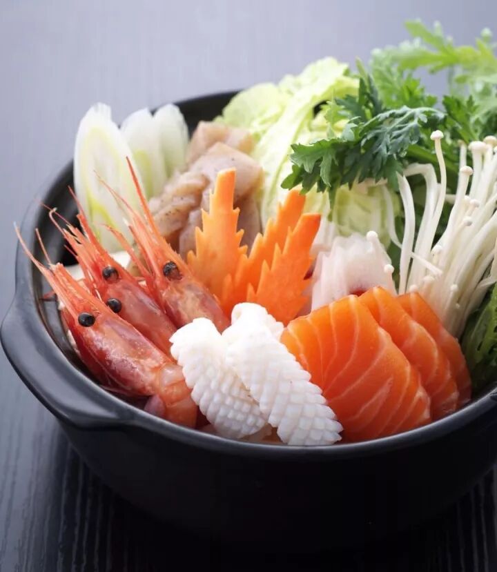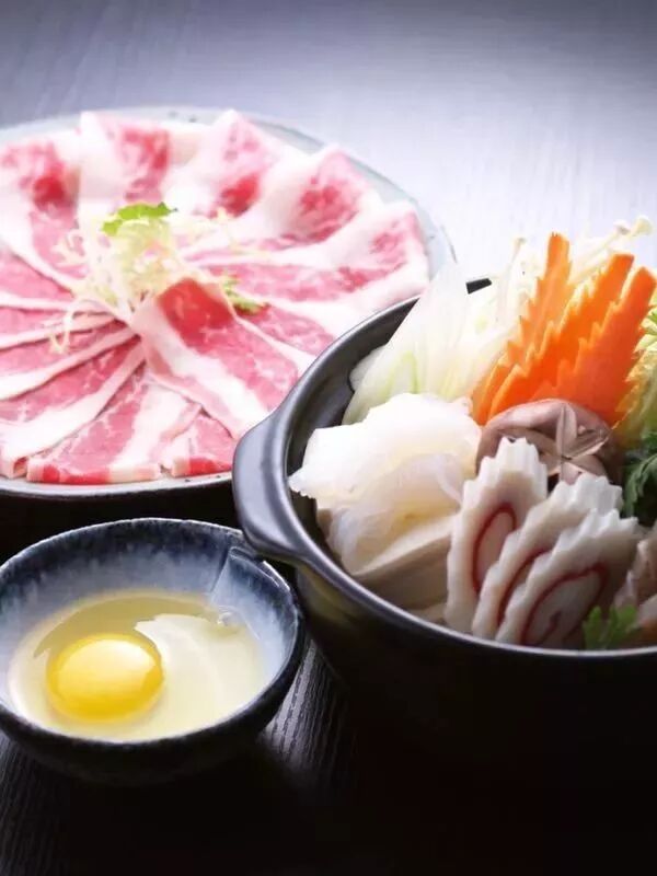 冬季日本流行火锅,将牛肉切成薄片和海鲜、蔬菜等一起放在锅里煮,吃的时候沾上生鸡蛋汁、酱油和糖做成的酱~