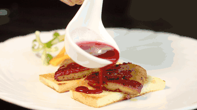 面包片和独家酱料也带上了鹅肝的鲜美味道,一口吃下去,完美突出了法国鹅肝肥腴的口感!