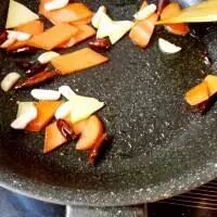 17.放入蒜姜略炒,放入胡萝卜略炒;