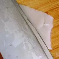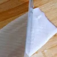 8.从下面的角开始,用刀跟划开的痕成直角,直着刀划下去,不要切断;