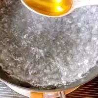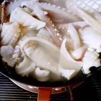 14.放入鱿鱼,看到鱿鱼打卷马上捞出沥干待用;