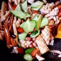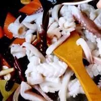 18.放入鱿鱼,和料汁,快速翻炒几下(大火);