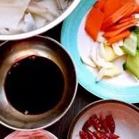 15.备料,葱姜切片,胡萝卜黄瓜切片,干辣椒撕卡去籽;