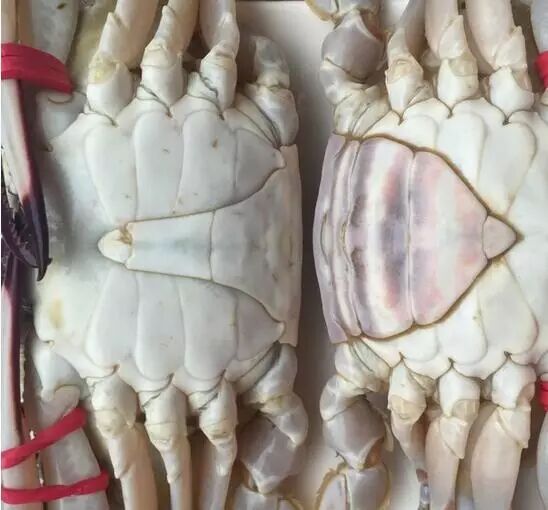 本地蟹腹部是青白色的,并略微突起,突起点较多,因为本地水温相对低一些。