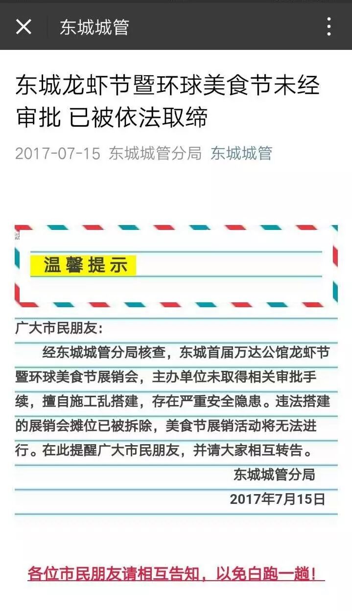 东莞东城龙虾节暨环球美食节未经审批,被依法取缔!