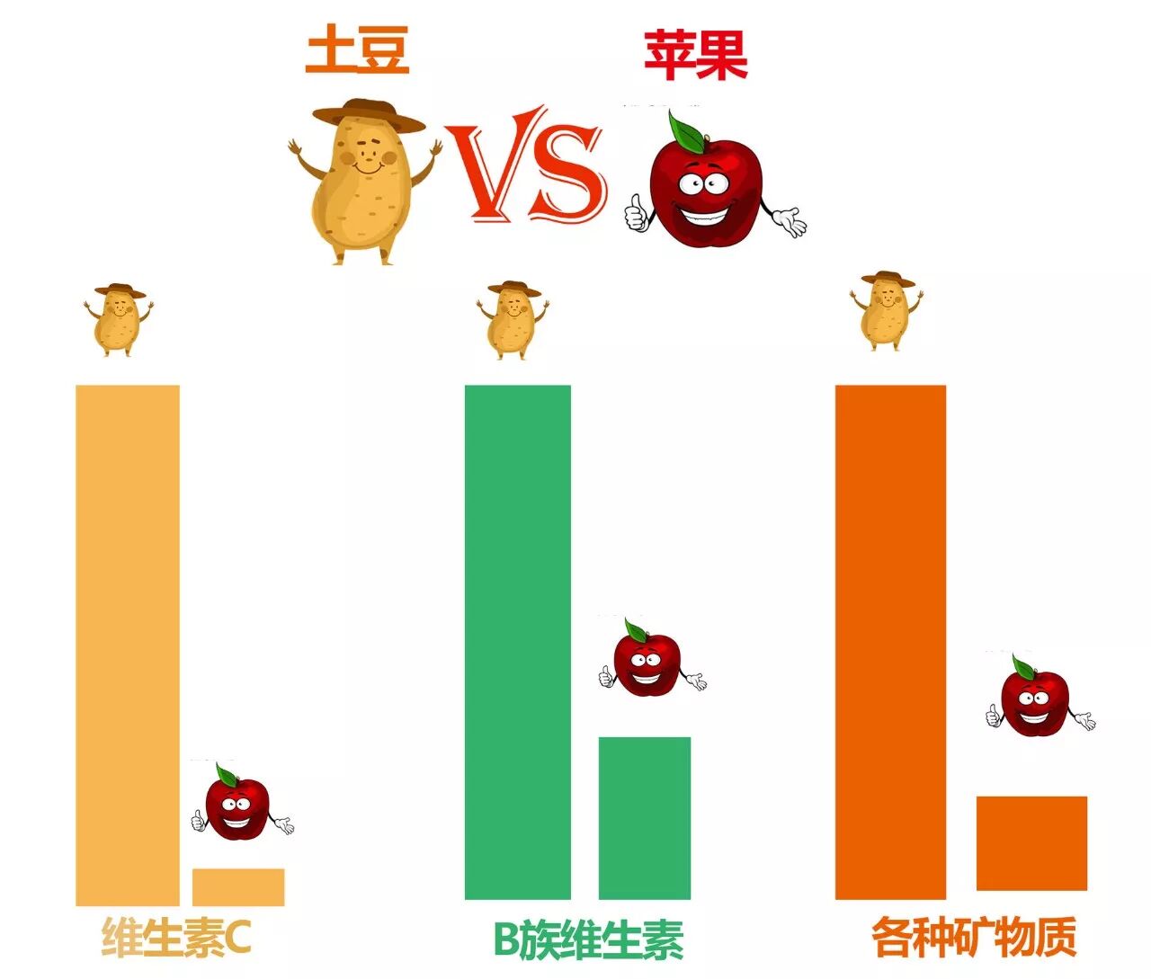 有研究表明:以一个3两的土豆为例,一个土豆的维A含量相当2个胡萝卜,钾含量相当于4个香蕉,花青素含量相当于4个草莓,而维C含量竟相当于10个苹果,B族维生素是苹果的4倍,各种矿物质是苹果的几倍至几十倍不等。
