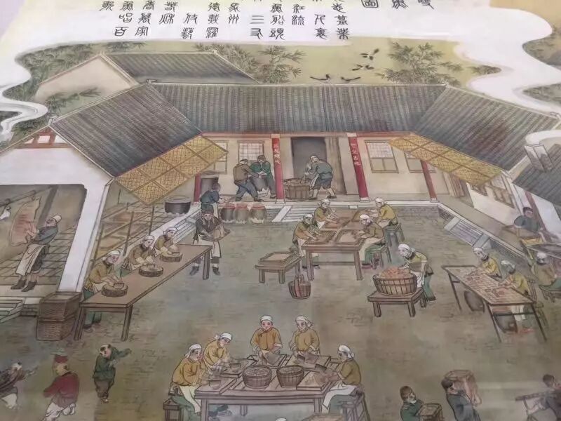 我们会一起去靖江双鱼肉脯的工厂参观,这是厂里大厅挂的那张巨幅绘画,描绘着肉脯的发展历史。