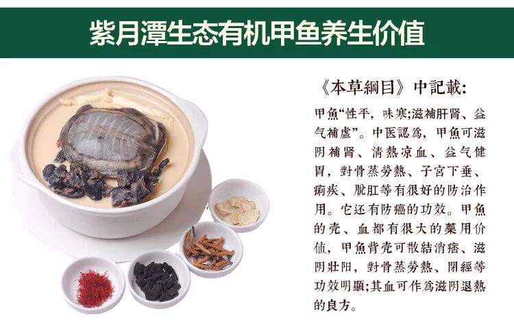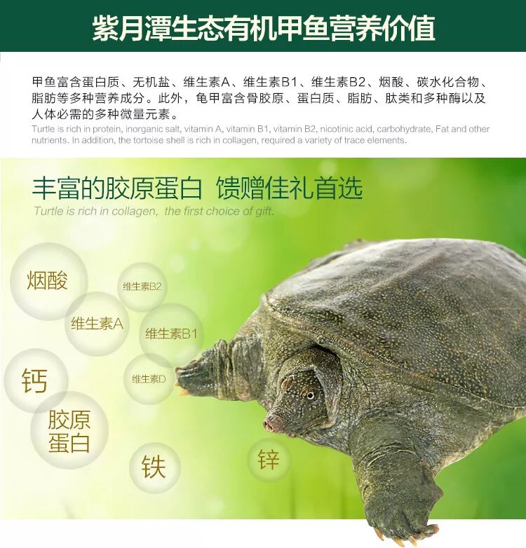 刘家湾生态甲鱼则是仿野生甲鱼的生活习性,自然生长,吸收大自然的精华之气,且不喂食任何有激素的饲料,相比温室甲鱼而言,其营养更丰富,滋补功效更佳。刘家湾生态甲鱼毫不逊色于野生甲鱼,胶质粘度高。肉质鲜美,营养丰富,增强免疫功能,是馈送亲友的理想产品 刘家湾生态甲鱼营养价值:富含蛋白质,无机盐,维生素A、维生素B1、维生素B2、烟酸、碳水化合物、脂肪等多种营养成分。此外,龟甲富含骨胶原,蛋白质、脂肪、肽类和多种酶以及人种必需的多种微量元素。