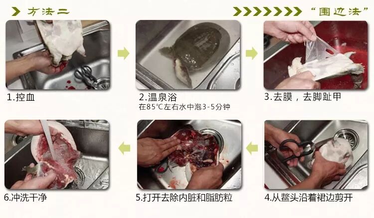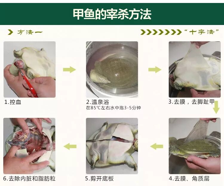 甲鱼的宰杀方法:引头-刀剁-放血-温开水去腊-开膛-清理