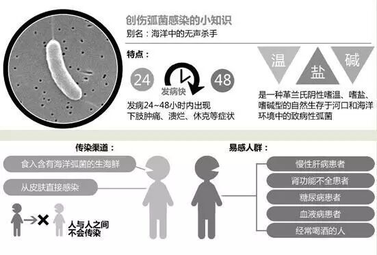 温州医科大学附属第一医院副院长、急诊中心主任卢中秋说,“创伤弧菌”又叫海洋中的无声杀手,“感染后,发病挺快,通常发病24至48小时内会出现下肢肿痛、溃烂、休克等,常导致多脏器功能不全,如不及时正确抢救,70%以上的患者会因多脏器功能衰竭而死亡。”
