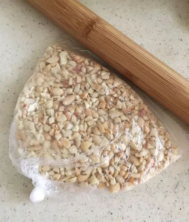 1、将烤箱调到180度预热之后放入花生,烤大约7分钟即可。烤好的花生晾凉之后放入保鲜袋,用擀面杖擀碎。