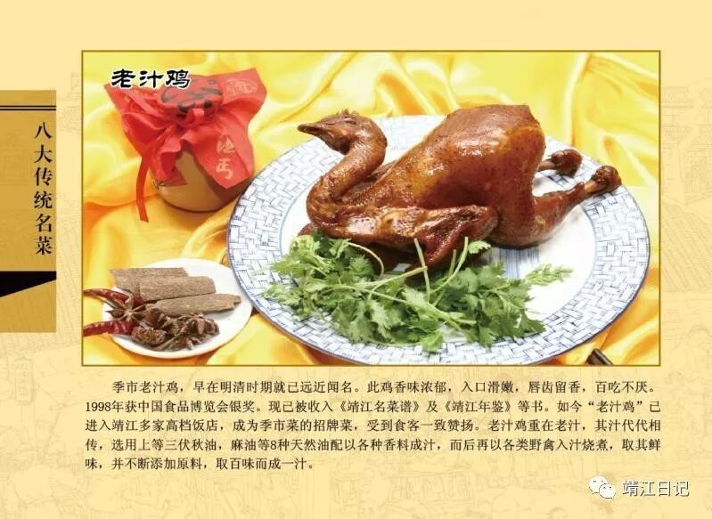 而今,老汁鸡和“季市小吃”已被列入靖江市级非物质文化遗产,季市镇被评为“靖江餐饮名镇”。“季市小吃”已经过包装走出靖江成为季市人乃至靖江人馈赠亲友的佳品。餐饮业也成为季市镇的重要支柱产业,每日接待各方食客近千人。这就是融入市场。