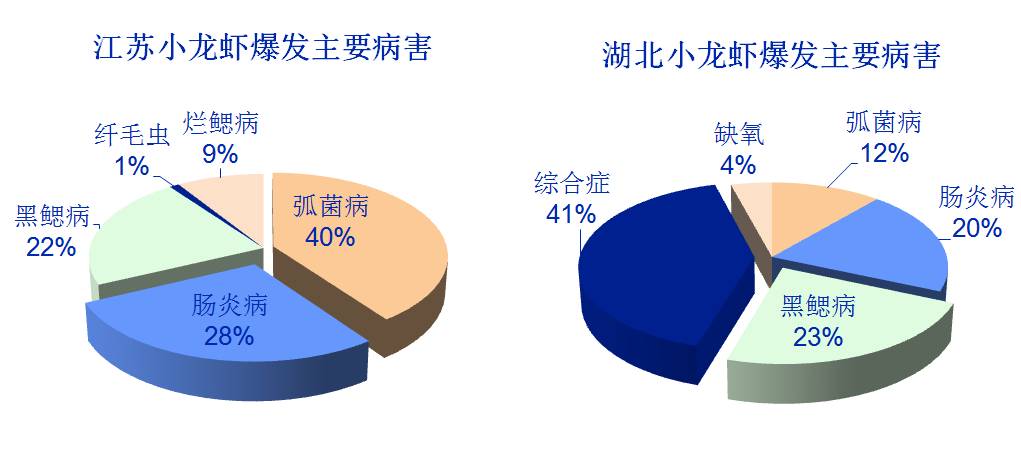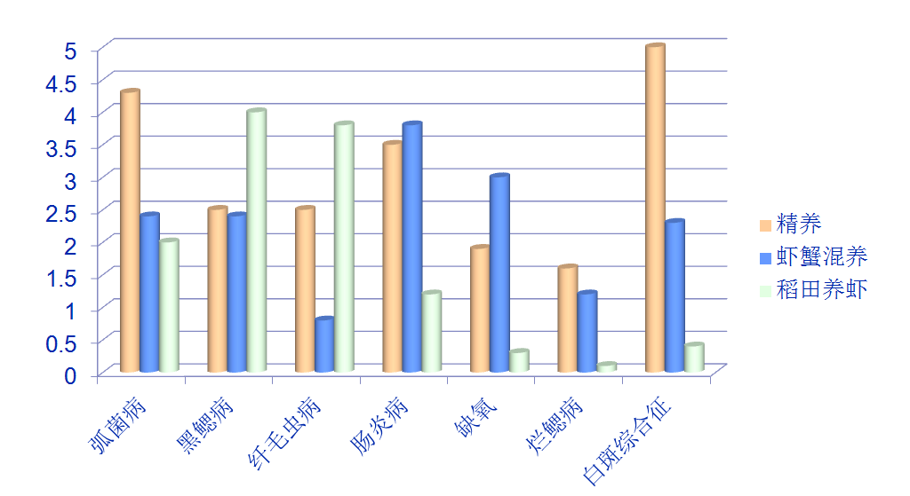 江苏小龙虾的主要养殖模式是虾蟹混养,湖北的小龙虾养殖主要是稻虾共生、虾蟹混养和精养,根据上面两张图表分析得出,养殖区域的不同和养殖模式的不同,主要爆发的病害也不同。江苏省小龙虾养殖病害主要以弧菌病、肠炎病和黑鳃病为主,湖北省小龙虾养殖病害主要以多种病害结合的综合征、黑鳃病和肠炎病为主。小龙虾的精养主要以白斑综合症、弧菌病和肠炎病为主,高密度的养殖使得小龙虾的病害更加的复杂和多样,同时,很多的养殖老板都是初养,弧菌的防控技术和养殖投喂管理都还不是很科学,最终导致了这几种病害在精养上面的高爆发率;虾蟹混养主要以肠炎病、弧菌病和缺氧为主,从这几种病害的爆发情况分析,虾蟹混养的管理核心是投饵管理、底质管理和水草管理。稻田养虾主要以黑鳃病、纤毛虫病和弧菌病为主,稻田养虾是针对水稻插秧、管理与收割的特点进行配套生产的一种龙虾养殖方式,这种养殖模式的发病率较精养要低的多,影响发病是主要的池塘的养殖环境为主,细菌、弧菌和虫害。