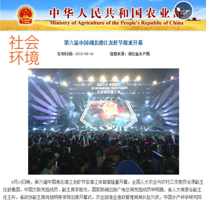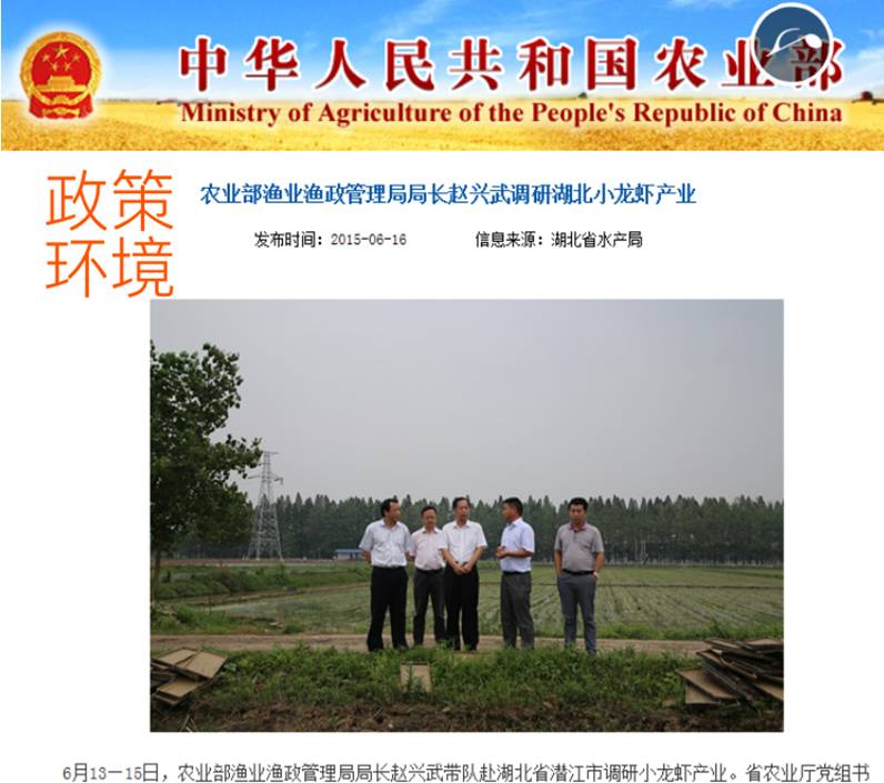 2015年6月13日-15日,,对湖北立足调结构、转方式,着力推广稻田综合养虾等生态高效养殖模式,加快发展特色产业,助推现代渔业建设的做法给予了充分的肯定。