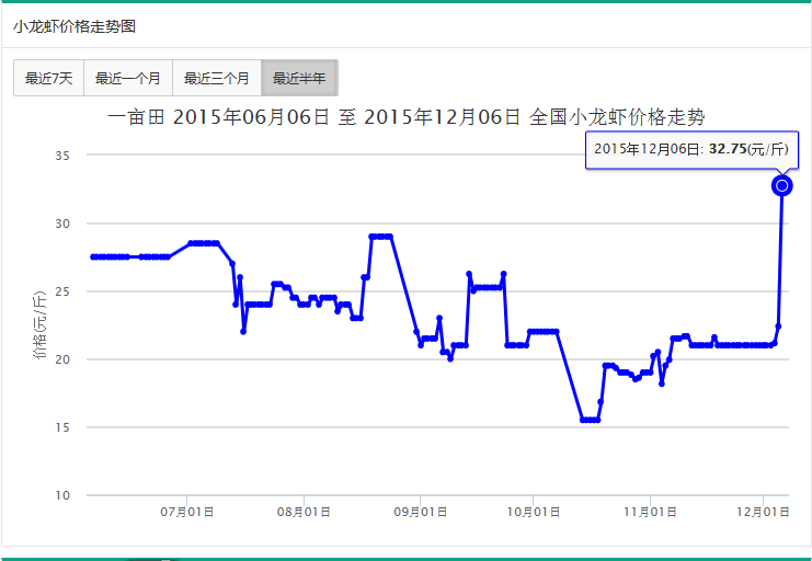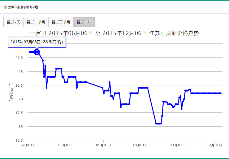这两张图表分别是全国的小龙虾后半年价格走势和江苏省的小龙虾后半年价格走势。就整体的均价而言,小龙虾今年的价格在15-40元/500g波动,去年的均价在10-26元/500g波动,涨幅在30%左右。