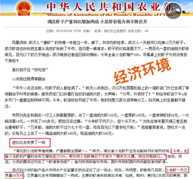 小龙虾具有适应力强、繁殖力高、病害少、食性杂、生长快、耐高温、耐低氧,且具有肉质细嫩、味道鲜美、营养丰富等优点,是一种经济价质很高的虾类。因此,养殖前景和经济效益均被看好,目前已成为国内最具发展潜力的养殖品种之一。本文就针对全国小龙虾养殖进行分析,内容包括:市场环境、养殖面积、价格走势分析、病害统计和消费现状几个方面。