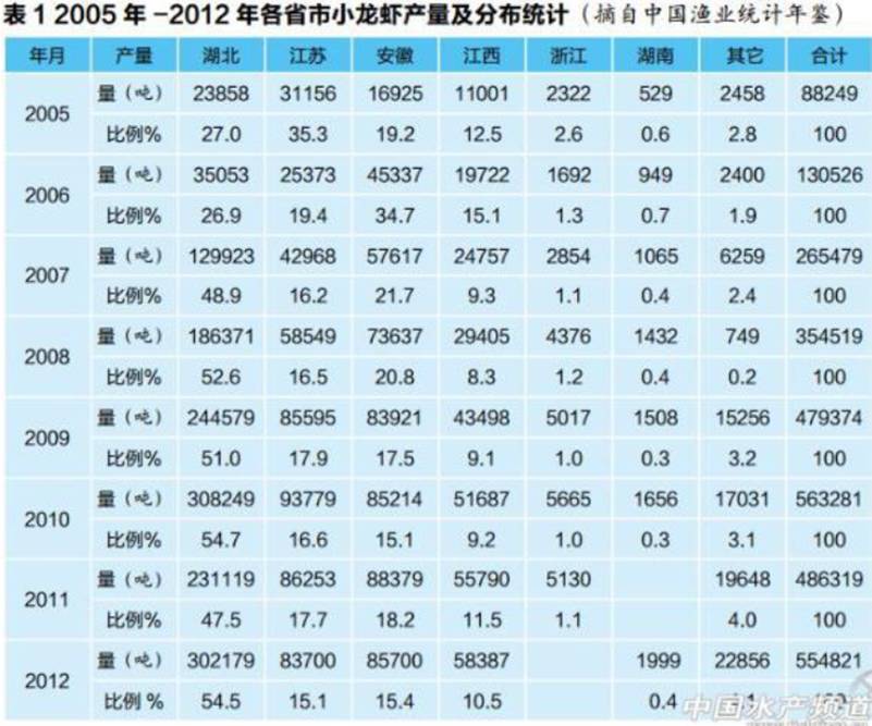 从图中,我们可以看出小龙虾养殖主要集中的省份在湖北、江苏、安徽、江西等地。其中2012年湖北的小龙虾产量占了全国小龙虾总产量的54.5%。
