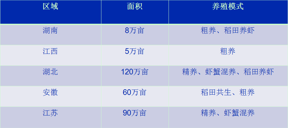 下图为全国小龙虾养殖主要集中区域的情况表,包括养殖面积、养殖模式、区域的每亩产量情况和每亩的效益情况。