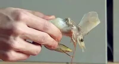 无独有偶,另一名潮汕网友也传了一段类似的视频。视频中,这名男子从虾头中剥出了一颗水滴状的半透明胶状物,看起来很像小果冻,但它却富有弹性,用手还很难捏破。