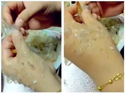 从视频中可以清晰地看到,这名女士在剥虾的时候,发现每个虾头和虾的腹部,竟然都藏着一团团的胶状物质,用手指轻轻一挤就滑出来了,这位女士一边剥虾,一边把这些胶状物贴在手背上,才剥了一盘虾的工夫,整个手背就全贴满了这些不明来历的胶状物,简直是触目惊心!