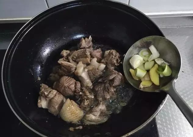 3、放入鸭块大火煸炒,颜色变白、汤里清澈水分减少的时候加入葱姜炒出香味,加入花椒粉提味、烹入料酒去腥