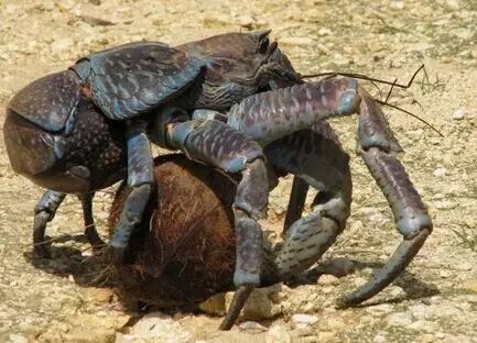 椰子蟹其实不挑食,几乎什么都吃,有着超强嗅觉。成熟水果和腐烂尸体的味道会让它们闻风而动:水果、老鼠、同类,还会抢人的剩饭,所以它又叫“强盗蟹”。