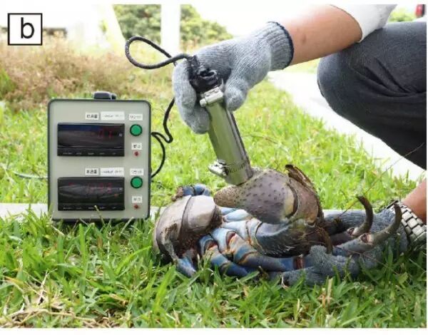 他们抓了29只野生椰子蟹并称重,记录下身体、腿和爪子的长度,然后让椰子蟹去夹这只柱状金属传感器▼