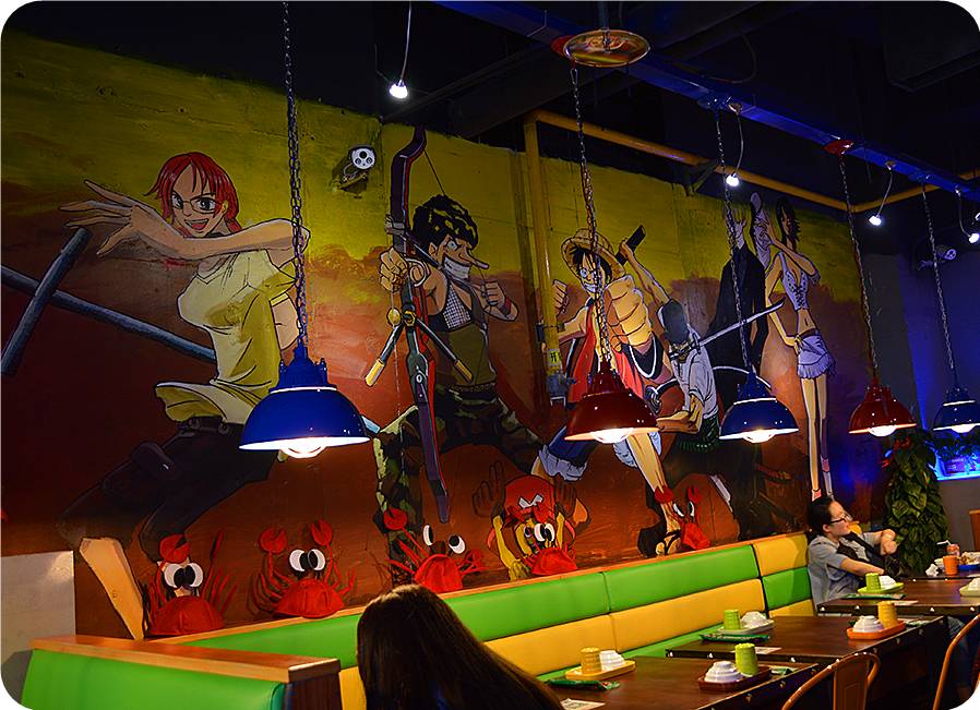 他的环境也是挺不错的,一进门就能看到海贼王的墙绘,渔网的隔断,还贴心的在每个桌子上面放上了自拍神器,带着草帽自拍的感觉,小伙伴确定不来试一试?