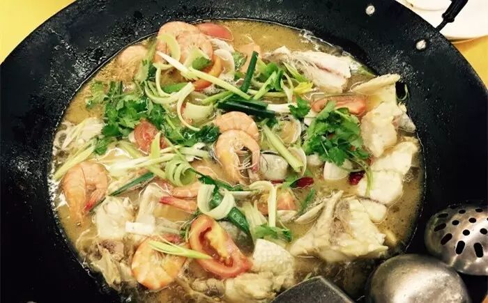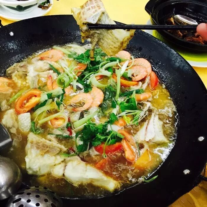 大鱼火锅 |鱼锅很大很深 ,鱼块在汤中哗哗地沸腾着。鱼切成巨大厚实的鱼肉块 ,夹一块就堆满了饭碗 。还有罗氏虾、白贝 ,香芹大蒜姜片椒段调味;肉肥汤鲜,鱼腩柔软香肥,量非常足!