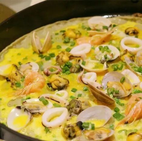 粤西海鲜烙 | 类似蚝仔烙的做法,但饼底很薄,脆脆的,有很多种海鲜。撒上葱花点缀很好看。