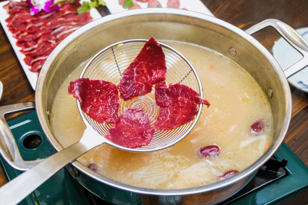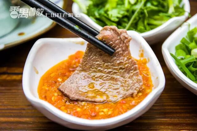 一碗汤下肚,瞬间打开胃口!拿起捞仔,一上一下倒数5秒,肉就好了~蘸着特制辣酱,这肉味真是~香!