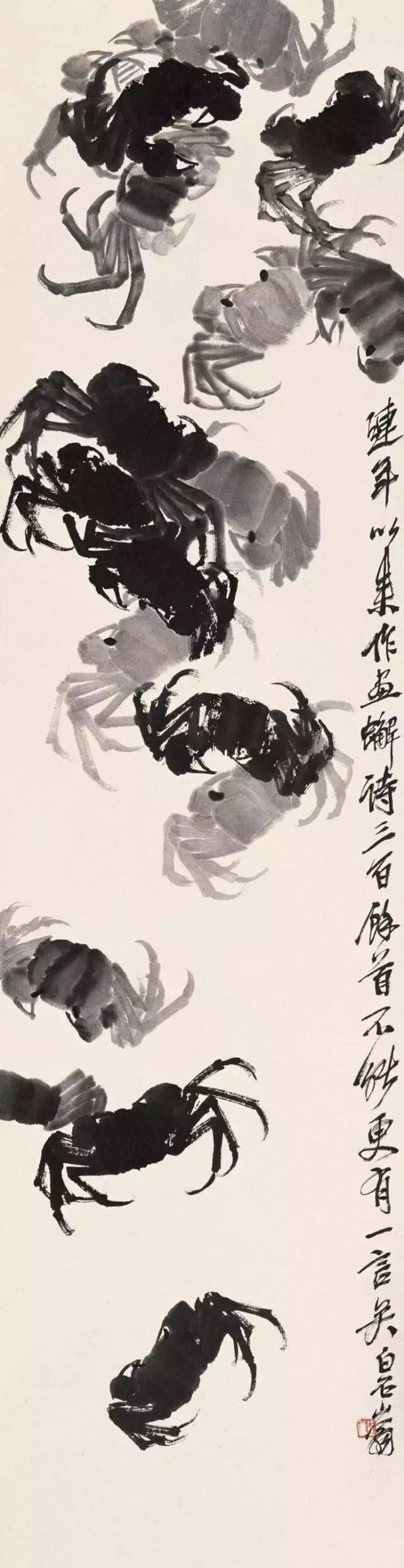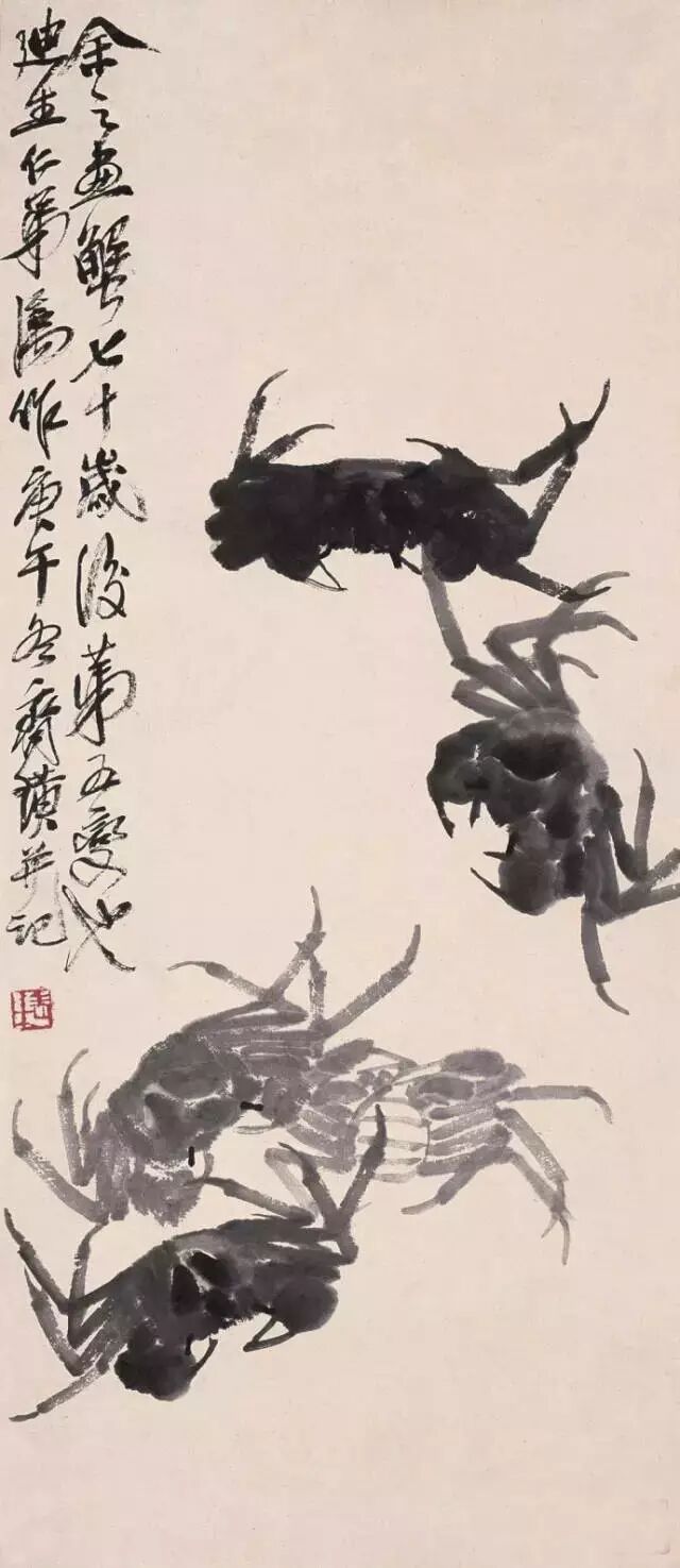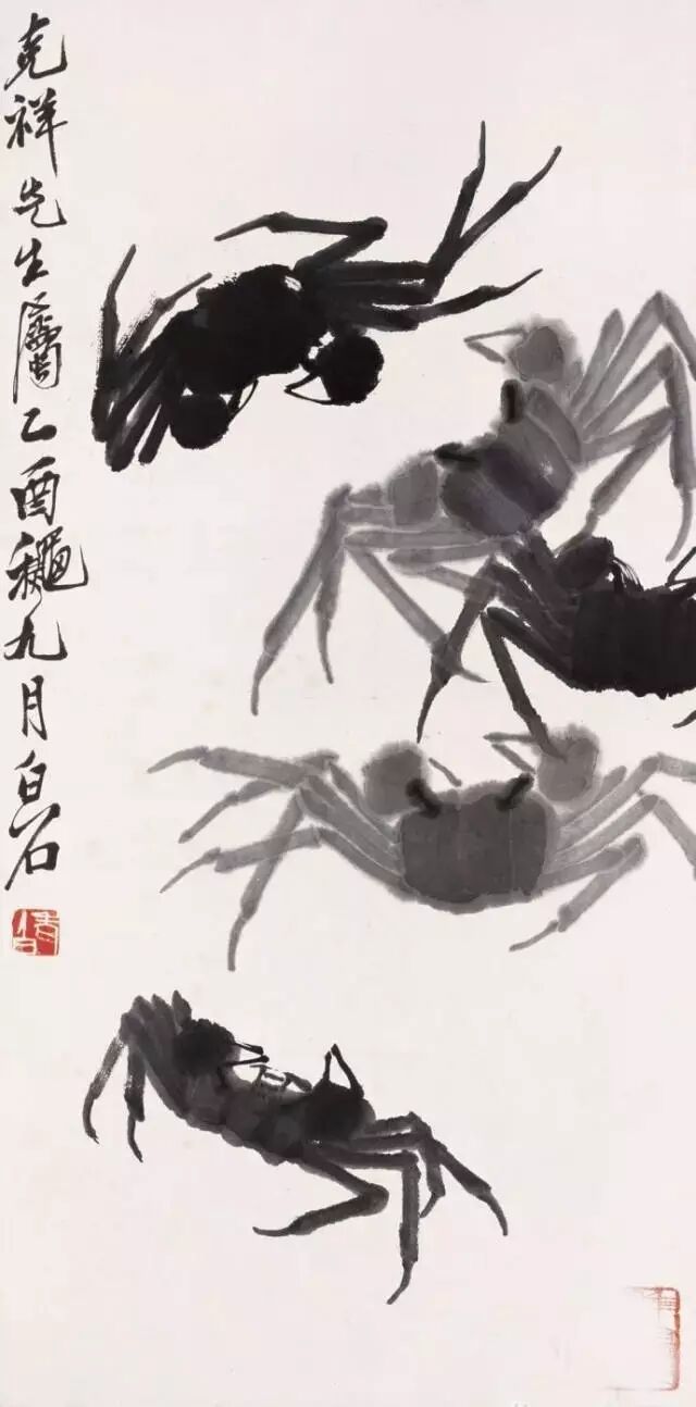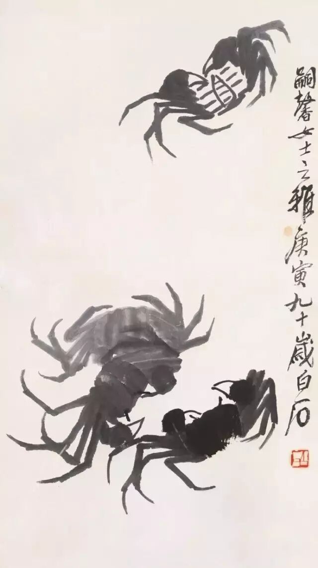 白石老人喜欢画螃蟹,也非常喜欢吃螃蟹。一日与家人吃饭,先生忽然停箸,敛气凝神地盯着盘中螃蟹,若有所思。