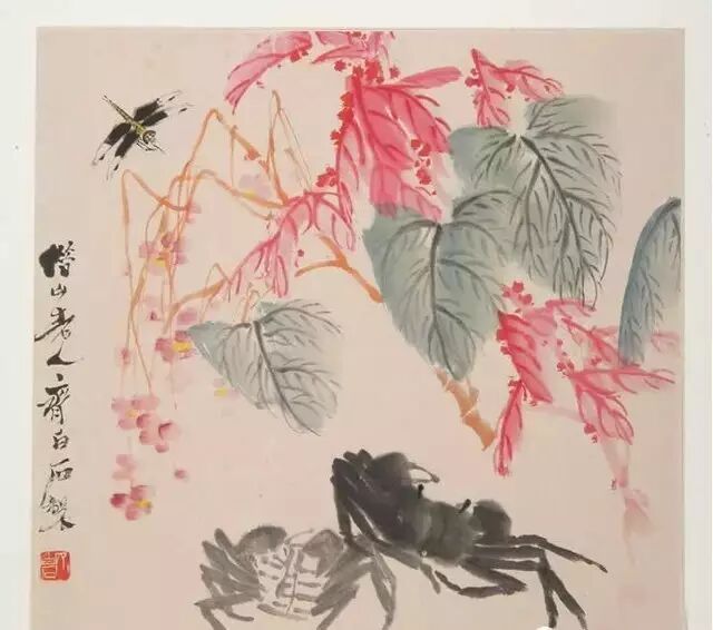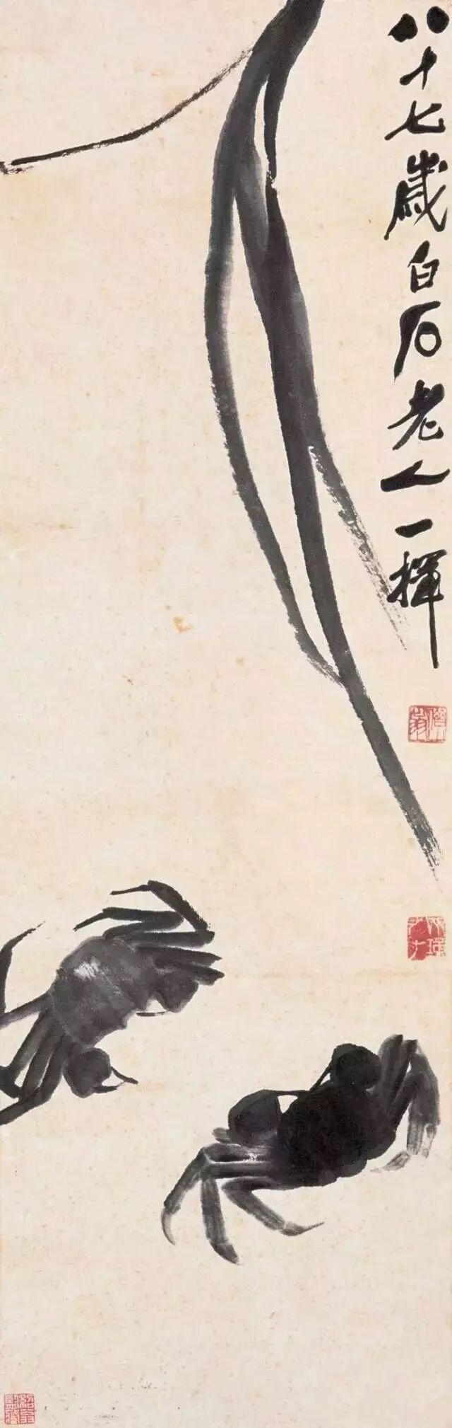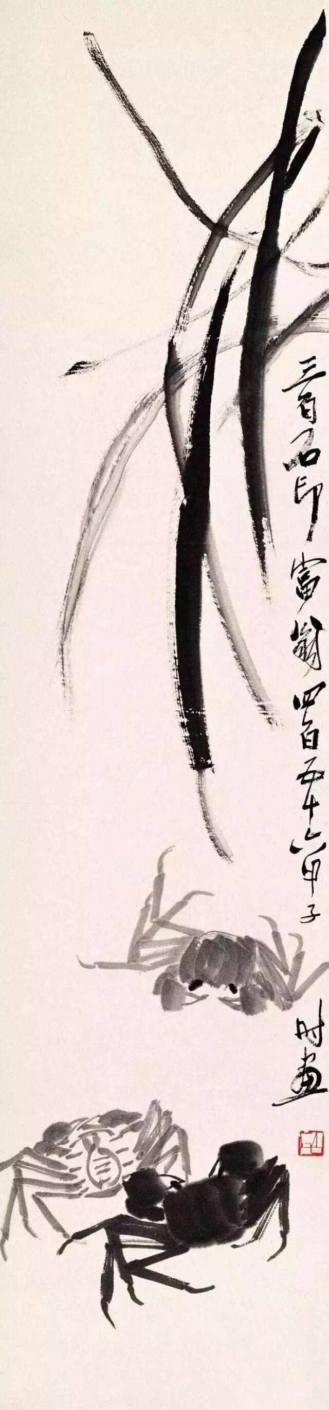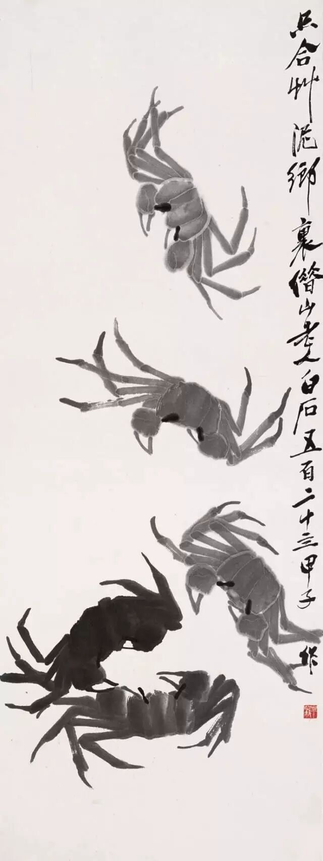 白石老人喜欢画螃蟹,也非常喜欢吃螃蟹。一日与家人吃饭,先生忽然停箸,敛气凝神地盯着盘中螃蟹,若有所思。
