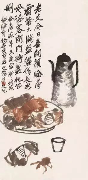 这副作品描绘的是画家生活中一个饮食的场景,以秋蟹、酒壶和酒杯入画,营造了把酒品蟹的温馨场景。好像如此还不够尽兴,老人又特意赋诗记之: