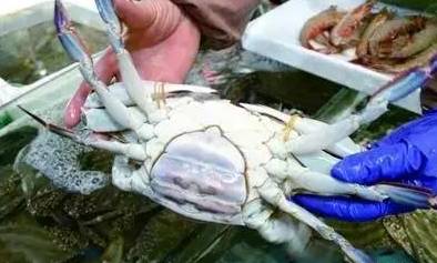 相比海捕梭子蟹,养殖的肚皮缝隙和蟹爪关节处发黑,这是最简单的区分方法。海捕蟹的肚皮看上去发亮有光泽,而且体内积泥很少。