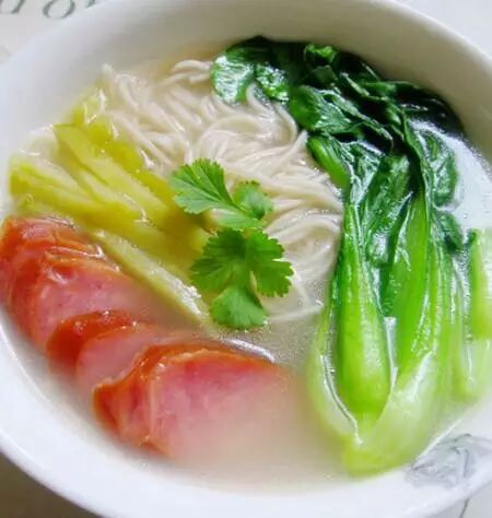 食材:面条150g、骨汤适量、油菜适量、榨菜适量、香肠适量、紫林醋适量