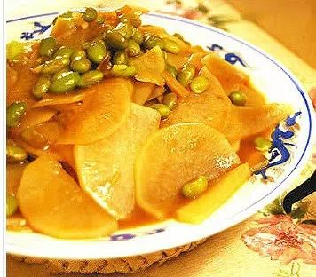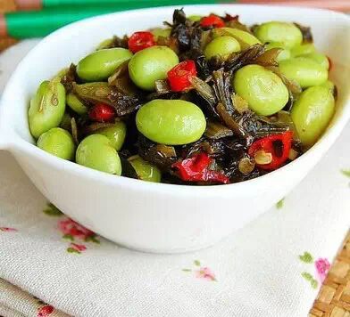 食材:毛豆200克、雪菜1袋(80克)、新鲜红辣椒2根、姜末、糖、盐少许、油适量