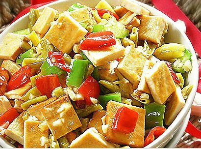 6、倒入煎好的豆腐,转中火小心翻炒一下;