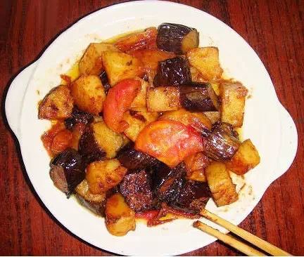 5、煎好茄子后,把西红柿和煎好的土豆一起倒进锅里。然后放入盐,油,胡椒粉,姜粉。十三香,生抽调味,加少许水煮3分钟出锅装盘。
